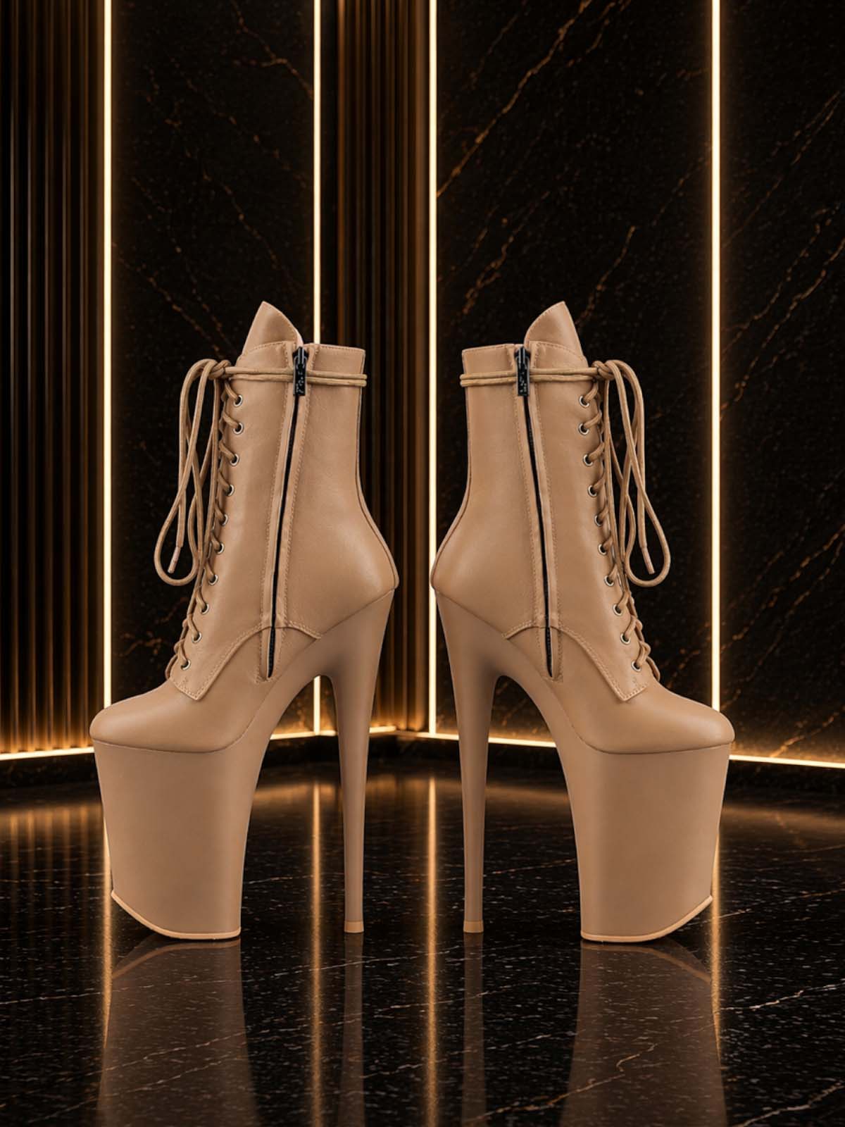Кожаные ботильоны четверки PRO в бежевом цвете на экстремальной высоте. Модель ботильон премиального качества за счет полностью натуральной кожи, как снаружи, так и внутри. Высота каблука 23 см., а высота платформы 13 см.